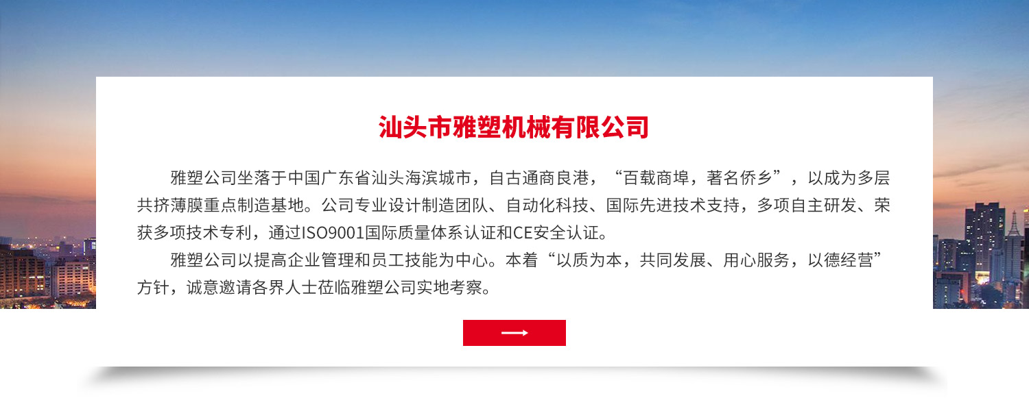 - 雅塑公司坐落于中國廣東省汕頭海濱城市,自古通商良港,“百載商埠,著名僑鄉(xiāng)”,以成為多層共擠薄膜重點(diǎn)制造基地。